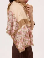 The ASYII Sweet Prelude Long Wrap presents a delicate balance of seasonal charm and modern design. Crafted in a soft beige base, it features an elegant pattern of snowflakes, with the upper and lower edges accented by blush pink geometric checks and festive wreaths. Meticulously finished with double-sided printing and fringe detailing, this silk-wool wrap adds the perfect finishing touch to your cold-weather style.