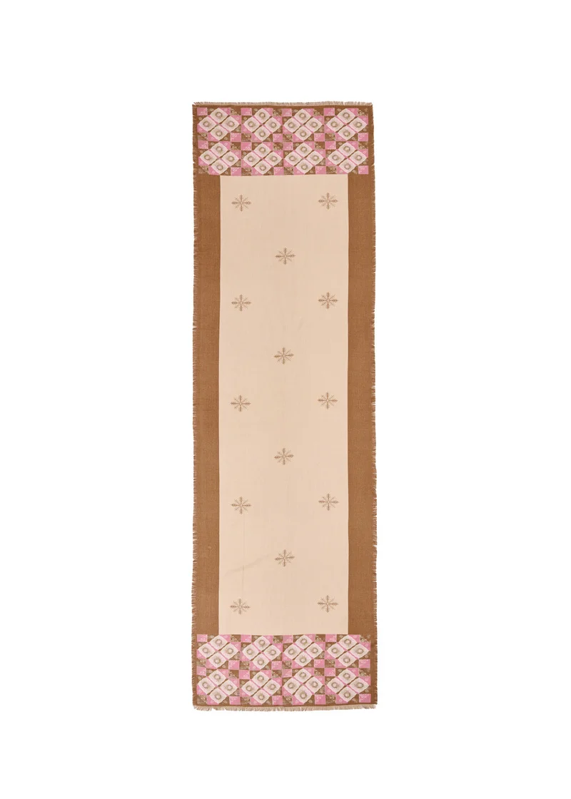 The ASYII Sweet Prelude Long Wrap presents a delicate balance of seasonal charm and modern design. Crafted in a soft beige base, it features an elegant pattern of snowflakes, with the upper and lower edges accented by blush pink geometric checks and festive wreaths. Meticulously finished with double-sided printing and fringe detailing, this silk-wool wrap adds the perfect finishing touch to your cold-weather style.